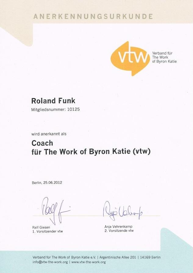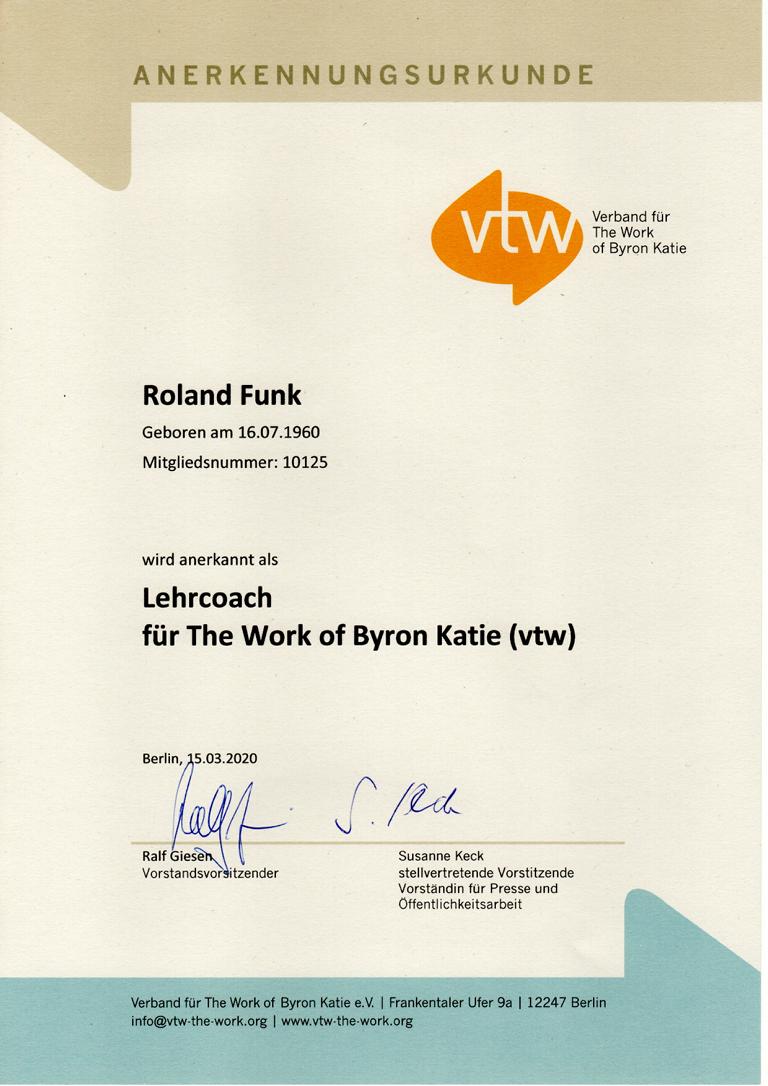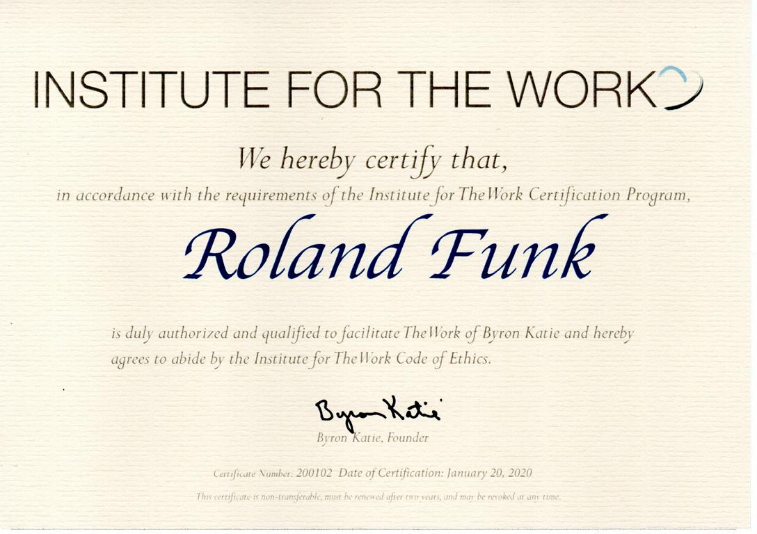 Das von Byon Katie ins Leben gerufene Institute for The Work itw hat ein umfangreiches Zertifizierungsprogramm angeboten, das ich in den Jahren 2016 bis 2020 absolvierte und mit der Zertifizierung zum "Certified Facilitator for The Work" abschloß. Mit diesem Abschluss erhielt ich dann das vom Verband für The Work das Siegel "Lehrcoach vtw", das mich berechtigt, Menschen zu Coaches für The Work (vtw) auszubilden.